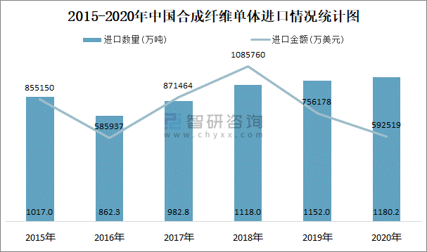 2015-2020年中國合成纖維單體進口情況統計圖