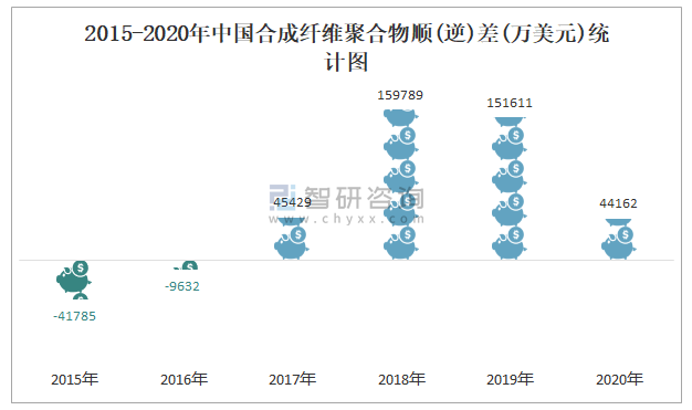 2015-2020年中國合成纖維聚合物順(逆)差(萬美元)統計圖