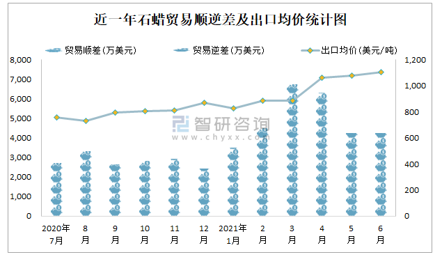 根據中國海關數據顯示:2021年6月中國石蠟進口數量為2.4萬噸,進口金額為2365萬美元;2021年6月石蠟出口數量為6萬噸,出口金額為6631萬美元;近一年中國石蠟出口總金額大于進口總金額,貿易順差為主,6月出口均價1105.2美元/噸。
