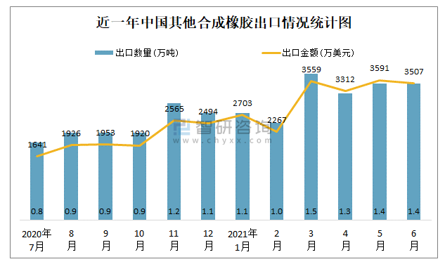 根據(jù)中國(guó)石油和化學(xué)工業(yè)聯(lián)合會(huì)數(shù)據(jù)顯示:2021年6月中國(guó)其他合成橡膠進(jìn)口數(shù)量為19.3萬(wàn)噸,進(jìn)口金額為34197萬(wàn)美元;2021年6月其他合成橡膠出口數(shù)量為1.4萬(wàn)噸,出口金額為3507萬(wàn)美元;近一年中國(guó)其他合成橡膠出口總金額小于進(jìn)口總金額,貿(mào)易逆差為主,6月進(jìn)口均價(jià)1771.9美元/噸。