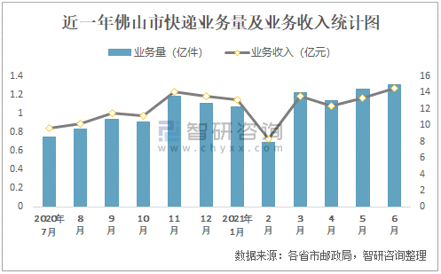 根據各省市郵政局數據可知:2021年6月佛山市快遞業務量為13040.99萬件,業務收入為144827.89萬元;2021年1-6月佛山市快遞累計業務量為66944.57萬件,同比增長74.79%,累計業務收入為751483.64萬元,同比增長43.96%;2016-2020年佛山市快遞業務量與業務收入均逐年遞增,平均單價2019年達到最大值,次年大幅度下滑。