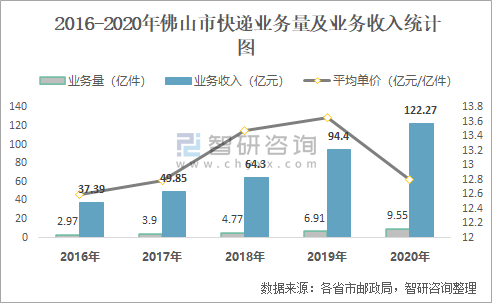 2016-2020年佛山市快遞業務量及業務收入統計圖