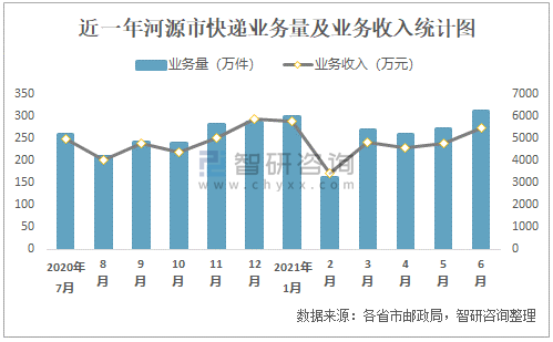 近一年河源市快遞業務量及業務收入統計圖