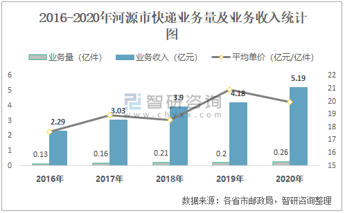 2016-2020年河源市快遞業務量及業務收入統計圖