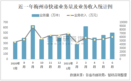 近一年梅州市快遞業務量及業務收入統計圖