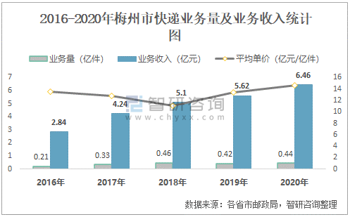 2016-2020年梅州市快遞業務量及業務收入統計圖