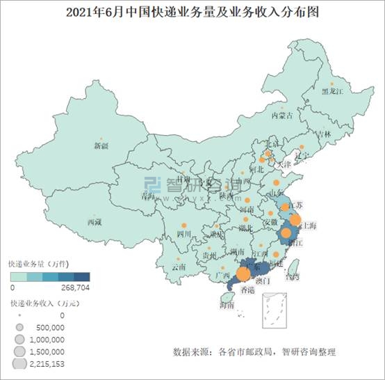 2021年6月中國快遞業(yè)務(wù)量及業(yè)務(wù)收入分布圖