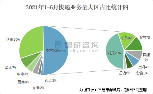 2021年1-6月快遞業(yè)務(wù)量大區(qū)占比統(tǒng)計圖