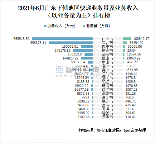 2021年6月廣東下轄地區(qū)快遞業(yè)務(wù)量及業(yè)務(wù)收入(以業(yè)務(wù)量為主)排行榜