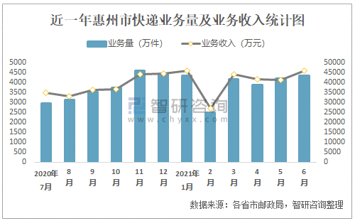 近一年惠州市快遞業(yè)務(wù)量及業(yè)務(wù)收入統(tǒng)計圖