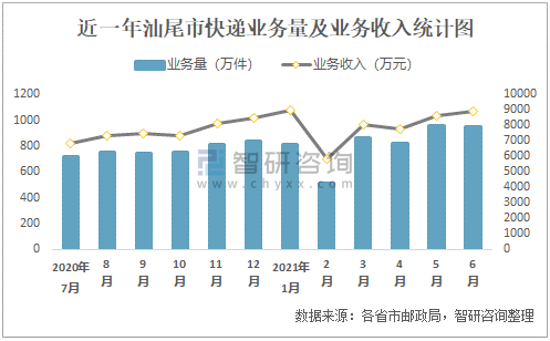 2021年6月汕尾市快遞業務量與業務收入分別為951.29萬件和8872.31萬元
