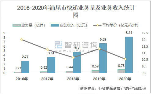 2016-2020年汕尾市快遞業務量及業務收入統計圖