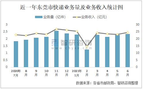 近一年東莞市快遞業務量及業務收入統計圖