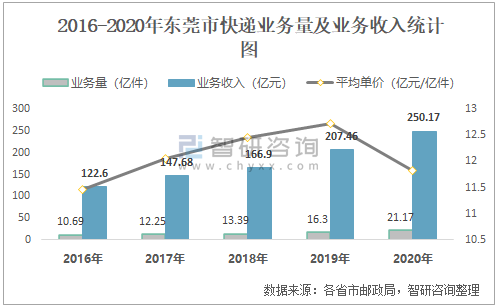 2016-2020年東莞市快遞業務量及業務收入統計圖
