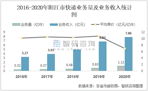 2016-2020年陽江市快遞業務量及業務收入統計圖