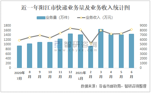近一年陽江市快遞業務量及業務收入統計圖