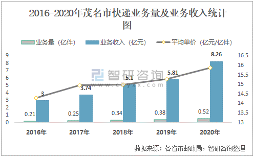 2016-2020年茂名市快遞業務量及業務收入統計圖