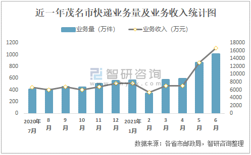 根據各省市郵政局數據可知:2021年6月茂名市快遞業務量為1007.28萬件,業務收入為16677.59萬元;2021年1-6月茂名市快遞累計業務量為3931.86萬件,同比增長62.18%,累計業務收入為56605.32萬元,同比增長32.66%;2016-2020年茂名市快遞業務量與業務收入均逐年遞增,平均單價總體呈現上升趨勢。