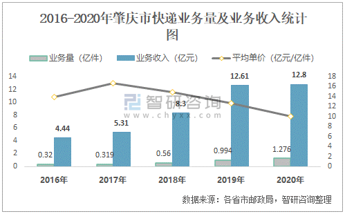 2016-2020年肇慶市快遞業(yè)務(wù)量及業(yè)務(wù)收入統(tǒng)計圖