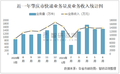 近一年肇慶市快遞業(yè)務(wù)量及業(yè)務(wù)收入統(tǒng)計圖