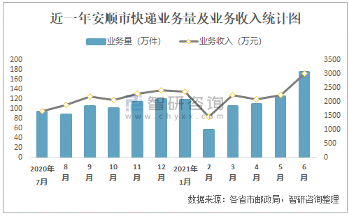 近一年安順市快遞業(yè)務(wù)量及業(yè)務(wù)收入統(tǒng)計(jì)圖