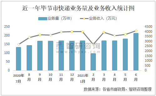 根據(jù)各省市郵政局?jǐn)?shù)據(jù)可知:2021年6月畢節(jié)市快遞業(yè)務(wù)量為211萬(wàn)件,業(yè)務(wù)收入為4092.26萬(wàn)元;2021年1-6月畢節(jié)市快遞累計(jì)業(yè)務(wù)量為994.08萬(wàn)件,同比增長(zhǎng)54.51%,累計(jì)業(yè)務(wù)收入為22025.11萬(wàn)元,同比增長(zhǎng)57.27%;2017-2020年畢節(jié)市快遞業(yè)務(wù)量總體呈現(xiàn)上升趨勢(shì),業(yè)務(wù)收入逐年遞增,平均單價(jià)總體呈現(xiàn)上升趨勢(shì)。