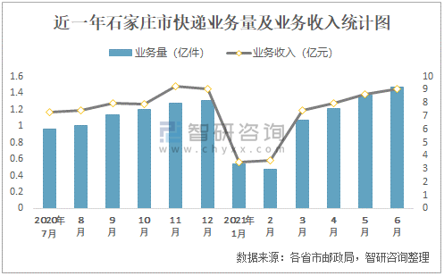 近一年石家莊市快遞業務量及業務收入統計圖