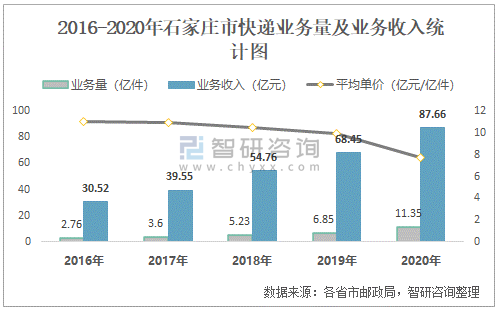 2016-2020年石家莊市快遞業務量及業務收入統計圖