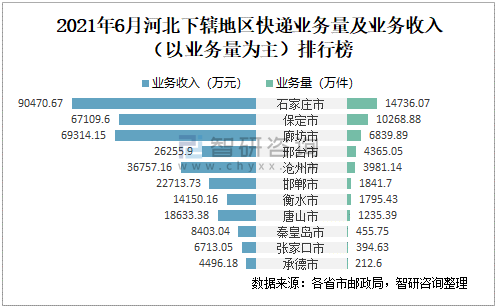 2021年6月河北下轄地區(qū)快遞業(yè)務(wù)量及業(yè)務(wù)收入(以業(yè)務(wù)量為主)排行榜