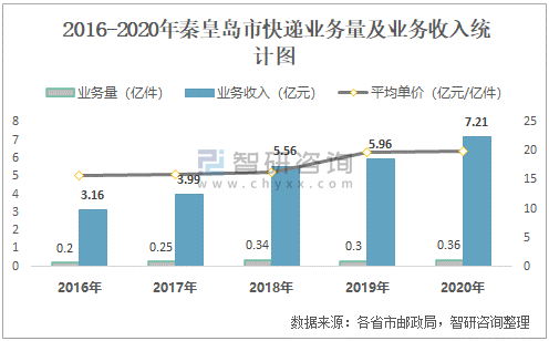 2016-2020年秦皇島市快遞業(yè)務(wù)量及業(yè)務(wù)收入統(tǒng)計(jì)圖