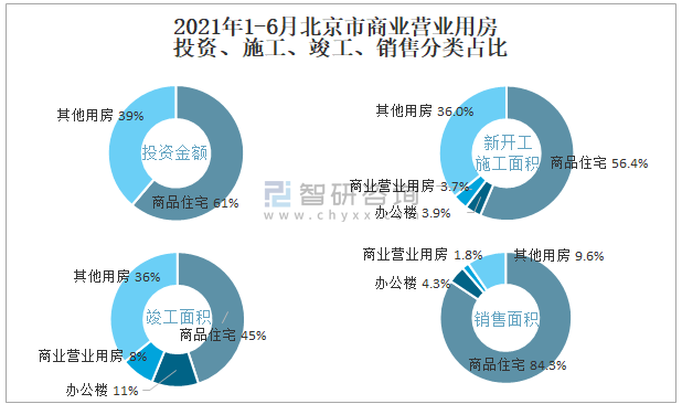 根據(jù)國家統(tǒng)計局?jǐn)?shù)據(jù)統(tǒng)計可知:2021年1-6月北京市房地產(chǎn)開發(fā)企業(yè)在包括商業(yè)營業(yè)用房在內(nèi)的其他用房投資金額占比為38.8%(注:只有投資金額中其他用房包含辦公樓、商業(yè)營業(yè)用房),商業(yè)營業(yè)用房的新開工面積與竣工面積所占比重差異不大,從銷售面積來看,商業(yè)營業(yè)用房銷售面積占比少于辦公樓銷售面積占比。