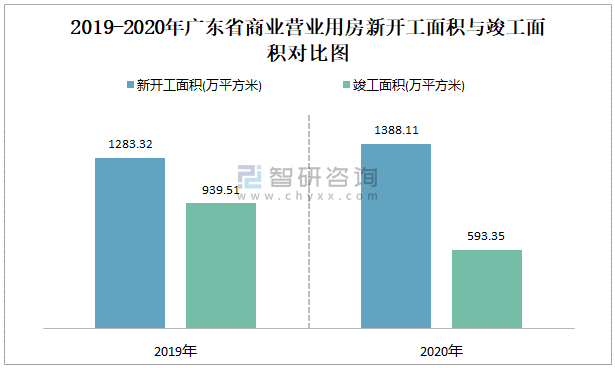 2019-2020年廣東省商業營業用房新開工面積與竣工面積對比圖