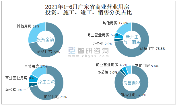 根據國家統計局數據統計可知:2021年1-6月廣東省房地產開發企業在包括商業營業用房在內的其他用房投資金額占比為28.3%(注:只有投資金額中其他用房包含辦公樓、商業營業用房),商業營業用房的新開工面積與竣工面積所占比重差異不大,從銷售面積來看,商業營業用房銷售面積占比高于辦公樓銷售面積占比。
