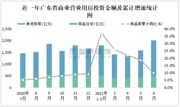 根據國家統計局數據統計可知:2021年6月廣東省房地產開發投資商品房投資金額為2006.28億元,其中包括辦公樓、商業營業用房等其他用房520.4億元(注:辦公樓、商業營業用房未分開統計);2021年1-6月廣東省房地產開發投資包括商業營業用房在內的其他用房累計金額為2314.51億元。