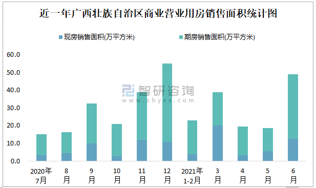 根據國家統計局數據可知:2021年6月廣西壯族自治區商業營業用房銷售面積為49.1萬平方米(其中銷售現房12.57萬平方米,期房36.53萬平方米);2021年1-6月廣西壯族自治區商業營業用房累計銷售面積為149.05萬平方米;近一年廣西壯族自治區商業營業用房期房銷售面積遠高于現房銷售面積。