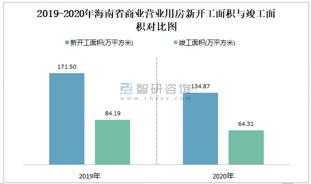 2019-2020年海南省商業營業用房新開工面積與竣工面積對比圖