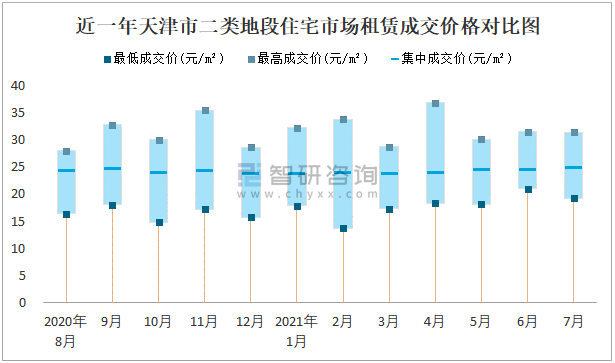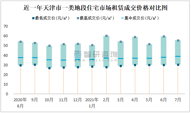 2021年7月天津市房屋租賃市場價格走勢:一類地段住宅市場租賃價格在30.53元/㎡-55.65元/㎡之間,集中成交價約為38.65元/㎡