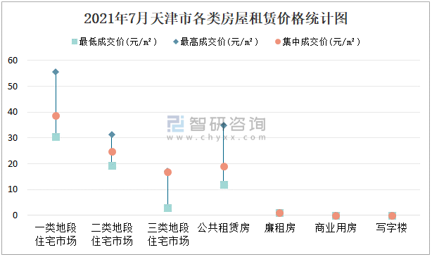 根據國信房地產信息網數據可知:2021年7月天津市7類房屋中,商業用房、寫字樓無統計數據,廉租房最低成交價、最高成交價、集中成交價均為1元/m²;一類地段住宅市場租賃最低成交價、最高成交價、集中成交價均高于其他類房屋價格;三類地段住宅市場租賃集中成交價約為16.82元/m²,公共租賃房租賃成交價在12元/m²-35元/m²之間波動,集中成交價為19.02元/m²。