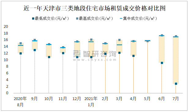 根據國信房地產信息網數據可知:近一年天津市一類地段住宅市場租賃成交價格有一定幅度波動,7月最高成交價與最低成交價差距為25.12元/m²;近一年天津市二類地段住宅市場租賃最低成交價與最高成交價的差距在10.48元/m²-20.01元/m²之間波動,今年2月差距達到最大;近一年三類地段住宅市場租賃集中成交價在13.6元/m²-17.12元/m²之間波動,7月集中成交價為16.82元/m²。