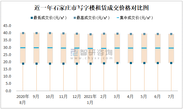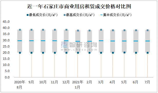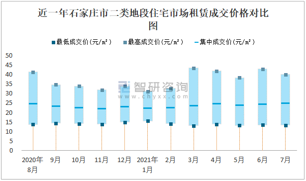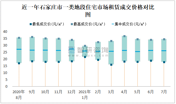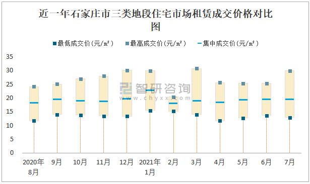 2021年7月石家莊市房屋租賃市場(chǎng)價(jià)格走勢(shì):二類(lèi)地段住宅市場(chǎng)租賃價(jià)格在13.3元/㎡-40.01元/㎡之間,集中成交價(jià)約為24.52元/㎡