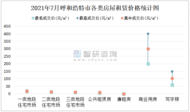 根據國信房地產信息網數據可知:2021年7月呼和浩特市7類房屋中,廉租房無統計數據,公共租賃房租賃集中成交價為9.2元/m²;商業用房租賃最低成交價、最高成交價、集中成交價均高于其他類房屋價格;三類地段住宅市場租賃集中成交價約為11.5元/m²。