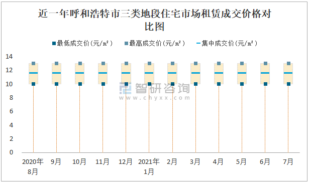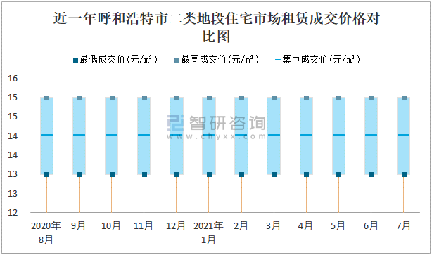 根據國信房地產信息網數據可知:近一年呼和浩特市一類地段住宅市場租賃成交價格有一定幅度波動,7月最高成交價與最低成交價差距為7元/m²;近一年呼和浩特市二類地段住宅市場租賃價格基本穩定在13元/m²-15元/m²之間;近一年三類地段住宅市場租賃成交價格在10元/m²-13元/m²之間波動,7月集中成交價為11.5元/m²。
