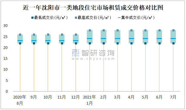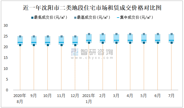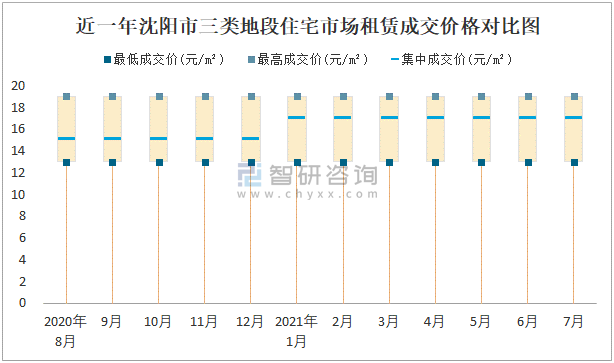 根據國信房地產信息網數據可知:近一年沈陽市一類地段住宅市場租賃成交價格有一定幅度波動,7月最高成交價與最低成交價差距為6元/m²;近一年沈陽市二類地段住宅市場租賃最低成交價與最高成交價的差距基本穩定在4元/m²;近一年三類地段住宅市場租賃成交價格在13元/m²-19元/m²之間波動,7月集中成交價為17元/m²。