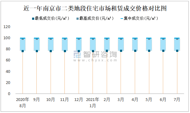 根據國信房地產信息網數據可知:近一年南京市一類地段住宅市場租賃成交價格有一定幅度波動,7月最高成交價與最低成交價差距為39.27元/m²;近一年南京市二類地段住宅市場租賃最低成交價與最高成交價的差距在21.78元/m²-22.05元/m²之間波動,2020年8月差距達到最大;近一年三類地段住宅市場租賃成交價格在42.95元/m²-88.42元/m²之間波動,7月集中成交價為79.8元/m²。