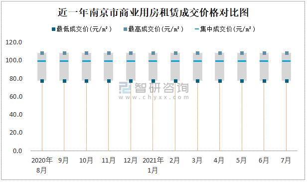 根據國信房地產信息網數據可知:近一年南京市商業用房租賃集中成交價比較穩定,在98.8元/m²-98.84元/m²之間波動,7月集中成交價為98.84元/m²;寫字樓租賃集中成交價今年6月達到最高值(89.63元/m²)。
