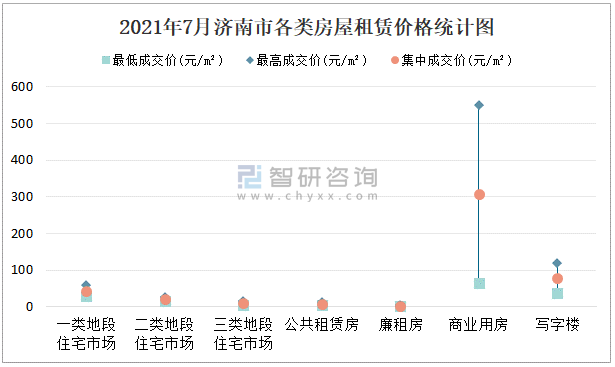 根據國信房地產信息網數據可知:2021年7月濟南市7類房屋中,公共租賃房租賃集中成交價為8.33元/m²,廉租房租賃集中成交價為3.11元/m²;商業用房租賃最低成交價、最高成交價、集中成交價均高于其他類房屋價格;三類地段住宅市場租賃集中成交價約為10.88元/m²。