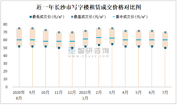 根據國信房地產信息網數據可知:近一年長沙市商業用房租賃集中成交價在160元/m²-170元/m²之間波動,7月集中成交價為160元/m²;寫字樓租賃集中成交價今年2月達到最高值(63元/m²)。