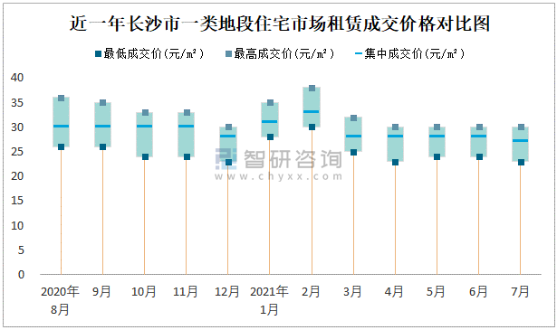 根據國信房地產信息網數據可知:2021年7月長沙市7類房屋中,公共租賃房、廉租房無統計數據;商業用房租賃最低成交價、最高成交價、集中成交價均高于其他類房屋價格;三類地段住宅市場租賃集中成交價約為17元/m²,寫字樓租賃集中成交價高于所有類型地段住宅市場租賃集中成交價。