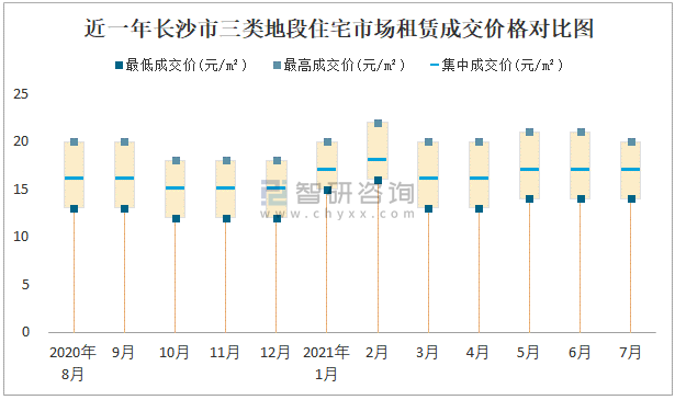根據國信房地產信息網數據可知:近一年長沙市一類地段住宅市場租賃成交價格有一定幅度波動,7月最高成交價與最低成交價差距為7元/m²;近一年長沙市二類地段住宅市場租賃最低成交價與最高成交價的差距在13元/m²-18元/m²之間波動,2020年8月差距達到最大;近一年三類地段住宅市場租賃成交價格在12元/m²-22元/m²之間波動,7月集中成交價為17元/m²。