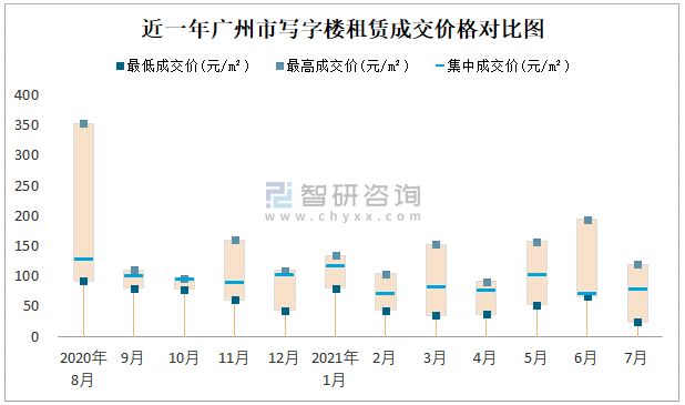 近一年廣州市寫字樓租賃成交價(jià)格對比圖